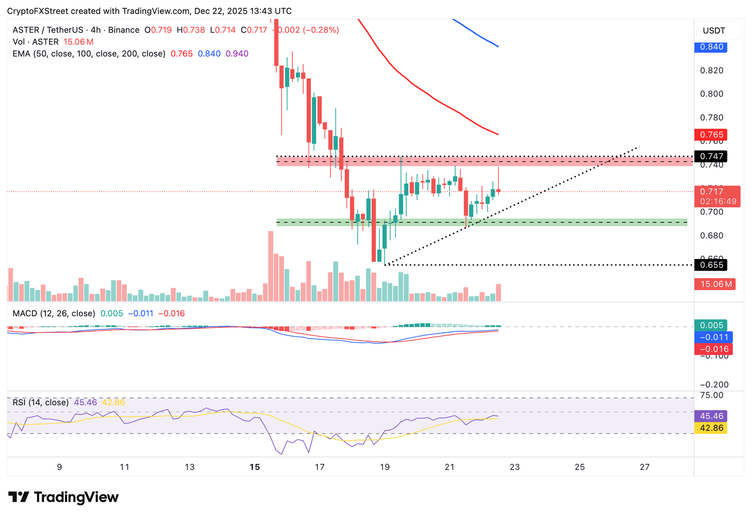 截至周一发稿时,Aster 的价格高于 0.70 美元。该代币的短期前景依然偏向中性至看涨,4 小时图上的相对强弱指数 (RSI) 为 46。要确认强劲的看涨观点,RSI 需要升至 50 中线上方。