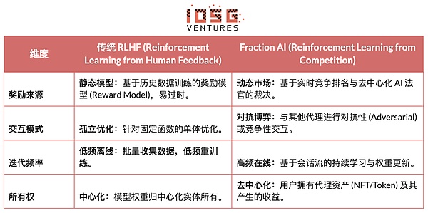 传统 RLHF 与 Fraction AI 的 RLFC 之间的核心差异: