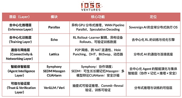 Gradient Network 核心愿景是通过“开放智能协议栈”(Open Intelligence Stack)重构 AI 的计算范式。Gradient 的技术栈由一组可独立演化、又异构协同的核心协议组成。其体系从底层通信到上层智能协作依次包括:Parallax(分布式推理)、Echo(去中心化 RL 训练)、Lattica(P2P 网络)、SEDM / Massgen / Symphony / CUAHarm(记忆、协作、安全)、VeriLLM(可信验证)、Mirage(高保真仿真),共同构成持续演化的去中心化智能基础设施。