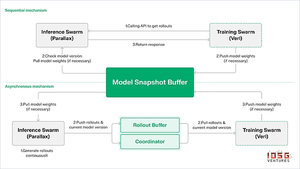 为维持策略与数据的一致性,Echo 提供顺序(Sequential)与异步(Asynchronous)两类轻量级同步协议,实现策略权重与轨迹的双向一致性管理: