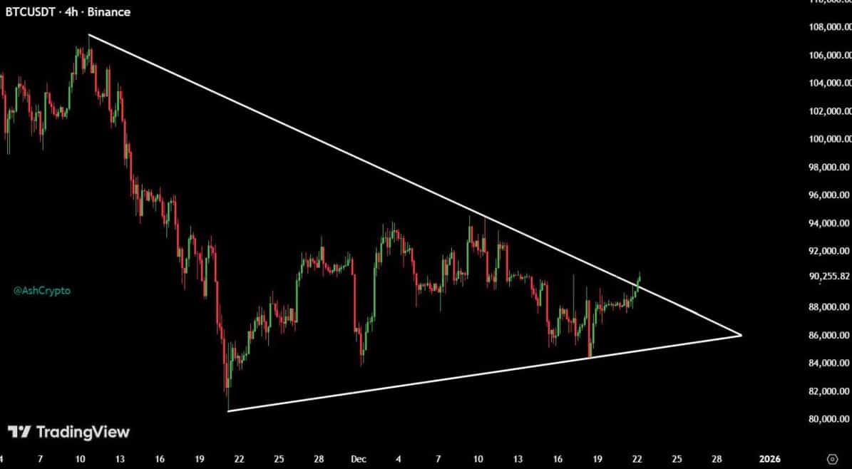 价格一直在对称三角形内压缩,较低的高点满足了 85,000 美元至 86,000 美元区域附近的稳定需求。