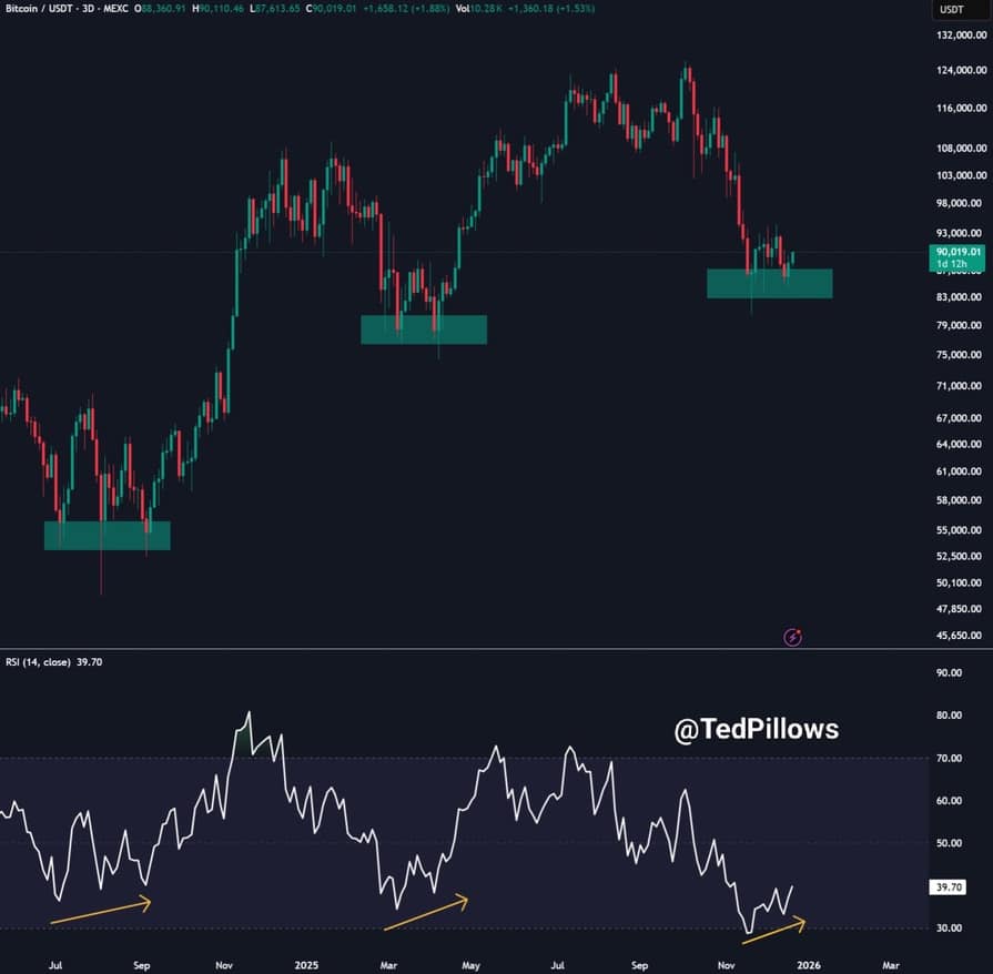 价格继续在近期低点附近保持明显的需要区域,而RSI指标显示出确认的看涨背离,表明下行压力正在减弱,而不是抛售潮再次出现。