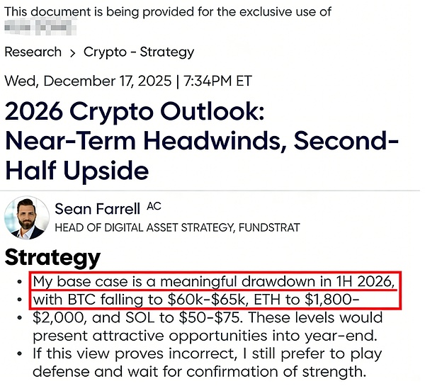 然而,当市场把目光从镜头前移向机构内部文件,画风出现反转:在 Tom Lee 创立的 Fundstrat 最新面向内部订阅客户的 2026 展望策略建议中,给出了相反的观点,其基准预测认为 2026 年上半年加密资产可能出现显著回撤,ETH 目标区间为 1800–2000 美元。这种“公开喊多”与“内部看空”的表述差异,也将 Tom Lee 本人与其关联机构推至舆论的风口浪尖。