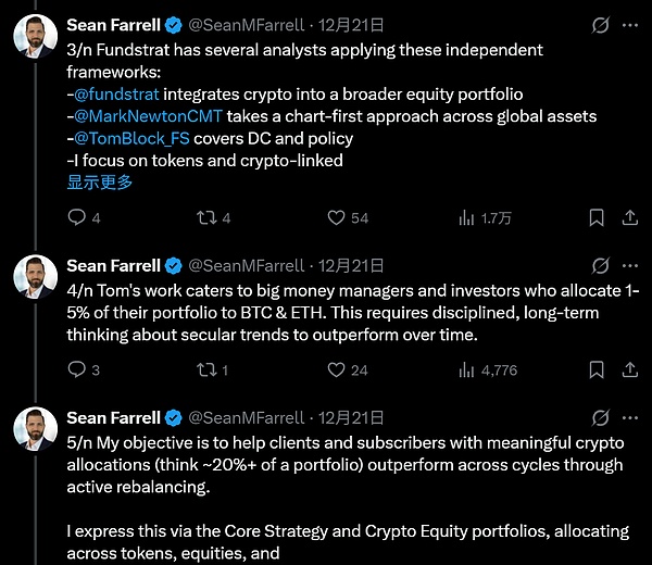 表示 Fundstrat 内部有多位分析师,各自采用独立的研究框架与时间尺度,以服务不同类型客户的目标;其中 Tom Lee 的研究更面向传统资产管理机构与“低比例配置”投资者(通常仅将 1%–5% 资产配置至 BTC/ETH),强调长期纪律与结构性趋势,而其本人则主要服务加密资产占比较高的组合(约 20%+)。但是 Tom Lee 本人在公开喊多 ETH 时并未声明自己是面向 “1%–5% 资产配置至 BTC/ETH” 的群体。