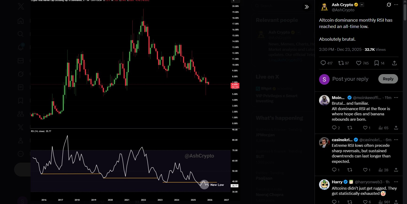 知名市场分析师 Ash Crypto 分享了一张关于 X 的重要图表。该图表追踪了山寨币的主导地位及其月度 RSI(相对强弱指数)。