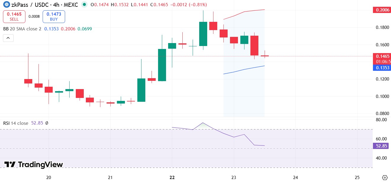 根据ZKP/USDC 4小时Tradingview图表,目前形势虽有风险但尚未失控。RSI指标接近53,表明该代币尚未进入超买区域。