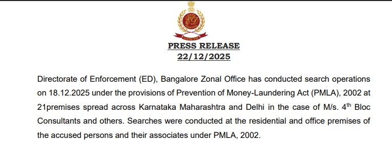 2025年12月18日,班加罗尔地区执法局根据《2002年防止洗钱法》对第四集团咨询公司及其关联公司进行了广泛的搜查行动。