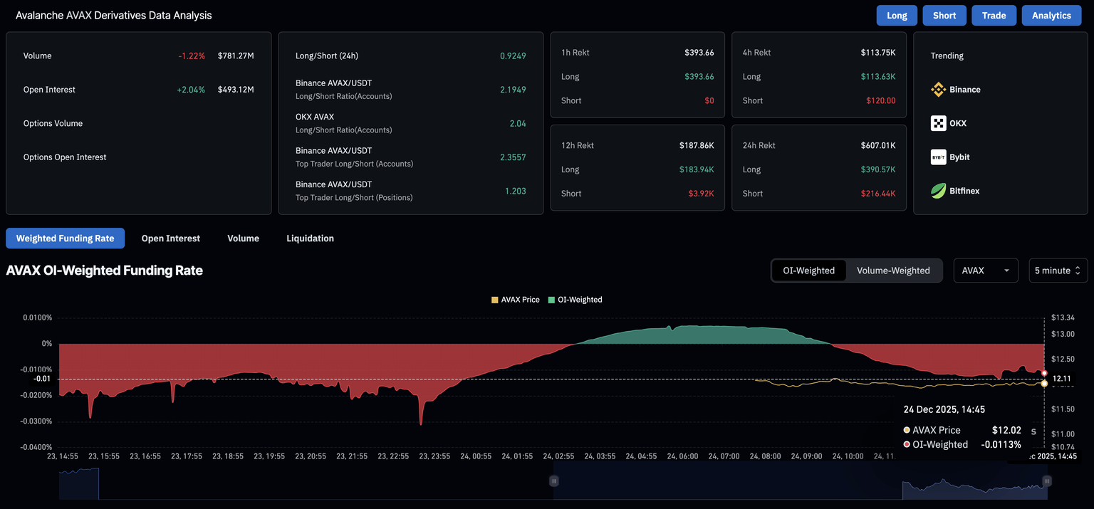 在衍生品方面,Avalanche 观察到新的资金流入,期货未平仓合约 (OI) 在过去 24 小时内增长 2.04%,达到 4.9312 亿美元。这表明交易员正在建立新的仓位,包括多头和空头头寸。