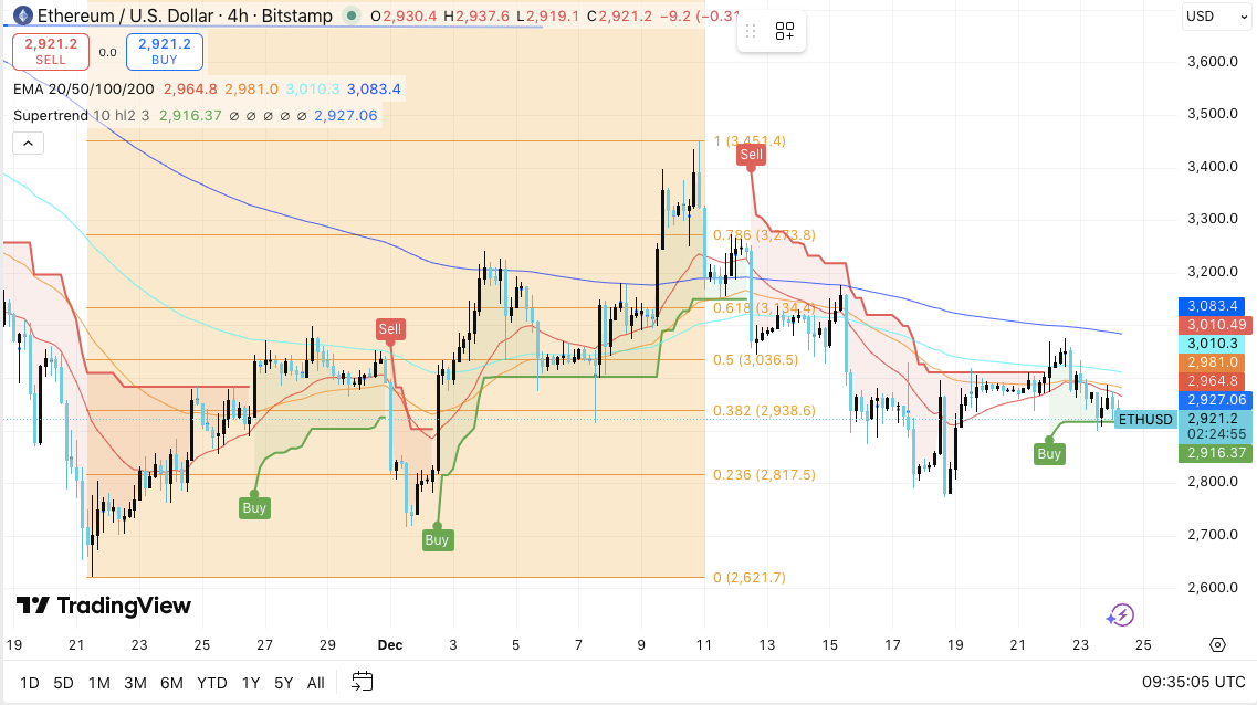 以太坊持续低于关键移动平均线,这些平均线目前决定着其短期走势。50周期均线(EMA)在2965美元附近构成直接阻力,而100周期均线在2980美元附近则加剧了抛售压力。
