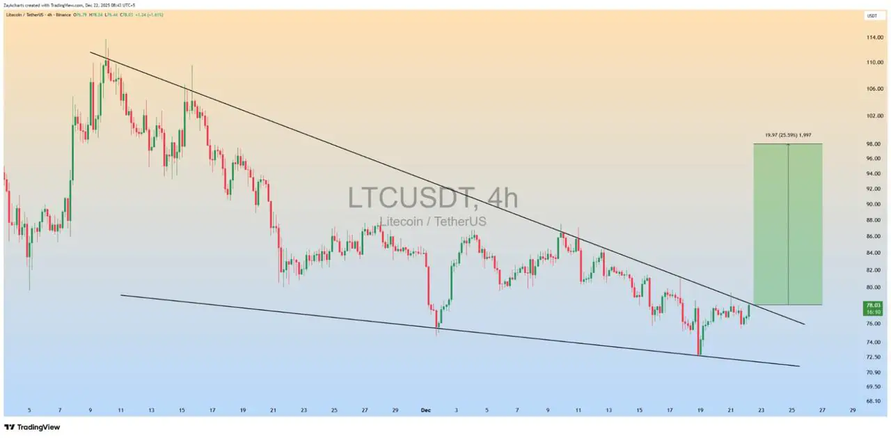 莱特币的走势呈现出截然不同的景象,其主要驱动力在于技术结构而非新闻报道。在四小时图上,莱特币的交易价格处于下降楔形形态内。这种形态通常预示着抛售压力减弱。自11月下旬以来,价格持续承压。买家继续在71-72美元附近的下轨附近进行防守。目前,莱特币的交易价格约为77.34美元,较上周略有下跌。