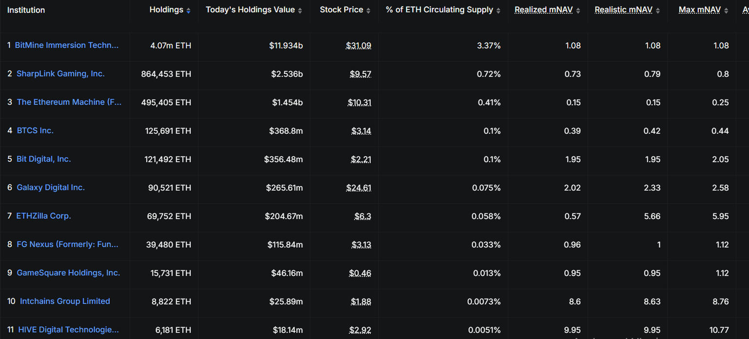 截至 12 月 24 日,BitMine 和其他 DAT 的购买压力已将以太坊国库公司的总持仓量推高至 587 万 ETH。
