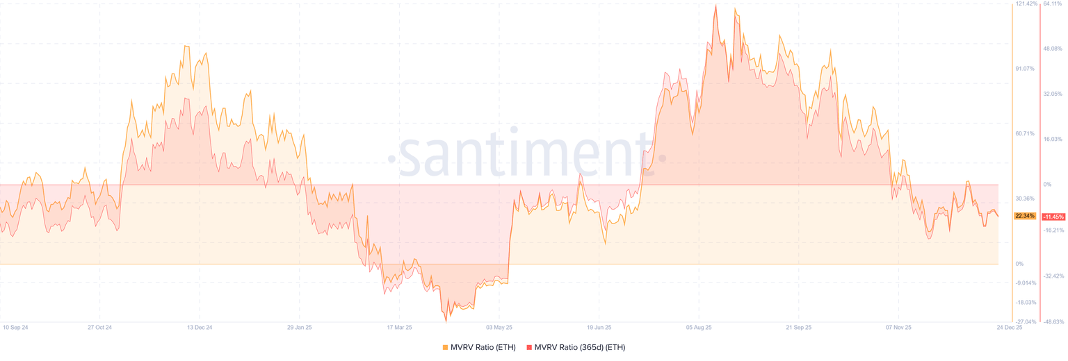 365 天 MVRV 指标显示,所有在 2025 年购买 ETH 的钱包都亏损了 11%。与此同时,综合 MVRV 比率显示,所有投资者都获得了 22% 的收益。