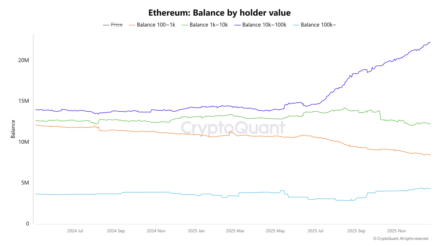 来自交易所和零售商的大量分布式供应流入了持有 1 万至 10 万枚 ETH 以及超过 10 万枚 ETH 的钱包。到 2025 年,这些钱包或巨鲸的 ETH 持有量分别增加了 797 万枚和 102 万枚。