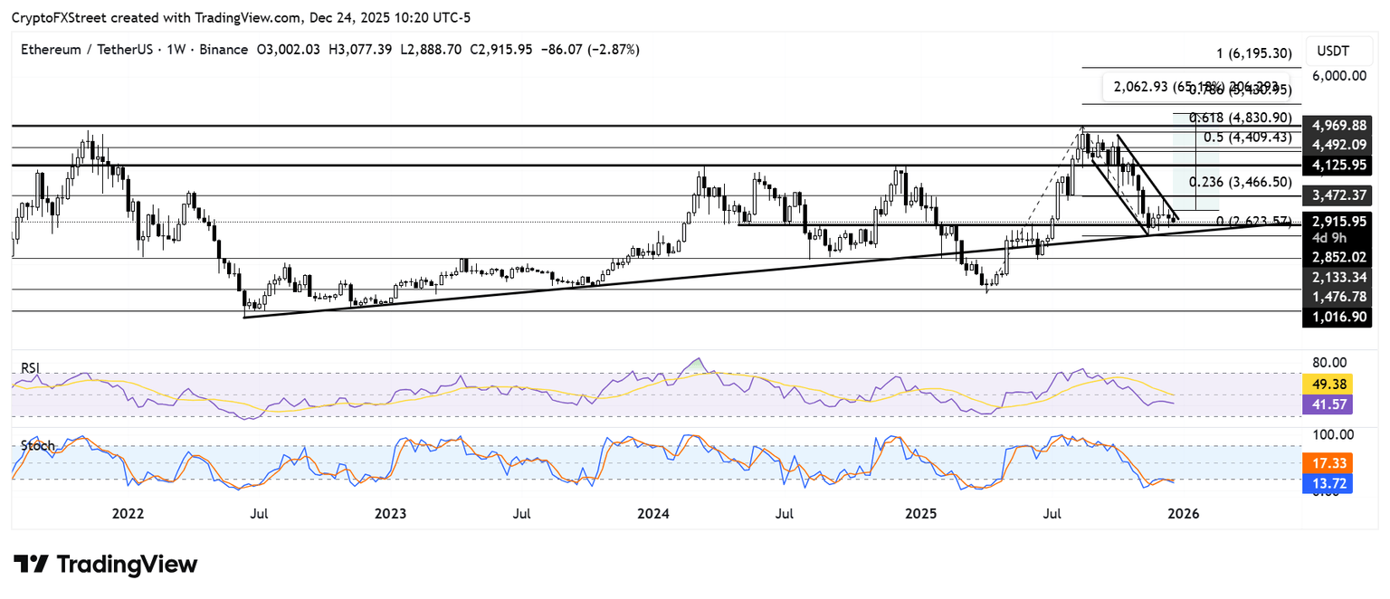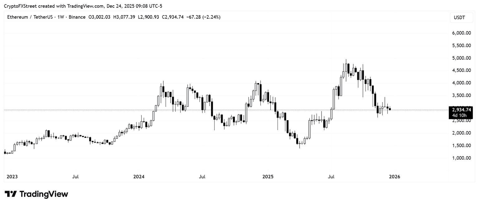 以太坊 (ETH) 在 2025 年下跌了 12%,从年初的 3,336 美元跌至 12 月第三周的 2,930 美元,与 2024 年 48% 的涨幅形成鲜明对比。但这个百分比并不能完全反映 ETH 在 2025 年的剧烈波动。