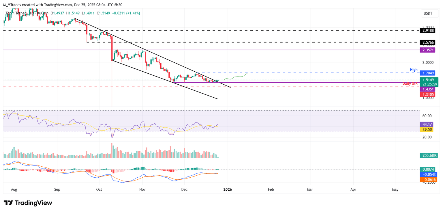 周三,Toncoin价格收盘价高于下降楔形形态(由两条趋势线连接多个高点和低点形成)。截至周四,TON交易价格高于1.51美元。