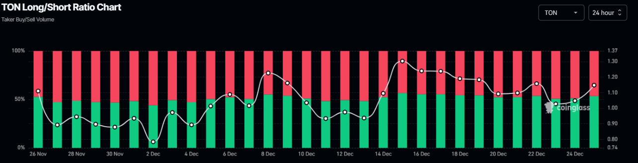 衍生品方面,CoinGlass周四公布的Toncoin多空比为1.14,接近月度高点。该比率高于1表明市场看涨情绪浓厚,交易员押注TON价格上涨。