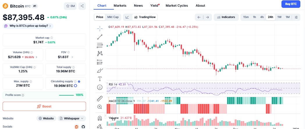 根据 CoinMarketCap 的数据,该代币上一次达到历史最高点是在 2025 年 10 月,约为 126,198 美元。此后,价格下跌超过 30%。目前,其交易价格接近 87,390 美元,日内小幅上涨约 0.67%。该代币的市值接近 1.7 万亿美元,但由于正值假期,交易量较低。