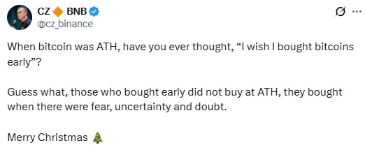 CZ提醒人们早期比特币买家并非在价格高位买入,而是在市场充满恐惧、不确定性和怀疑时入场。他的信息简洁、冷静且切合时宜。
