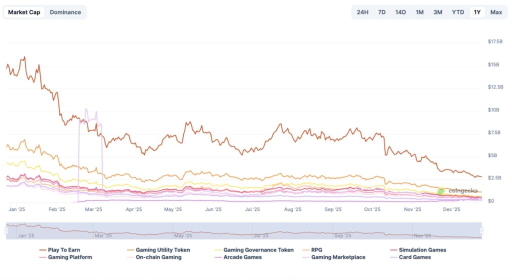 一些评论人士认为,2025年可能是该行业复苏的一年,他们指出,届时将出现更具可扩展性的区块链,以及在美国政府亲加密货币政策的推动下,监管环境将更加友好。然而,实际情况是,游戏活动未能恢复到之前的水平。根据CoinGecko的数据,P2E子行业的活动从年初的146亿美元骤降至28亿美元,降幅近81%。