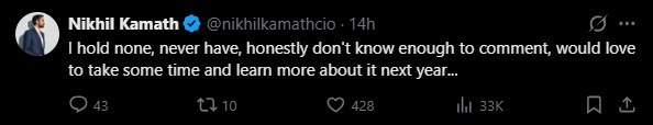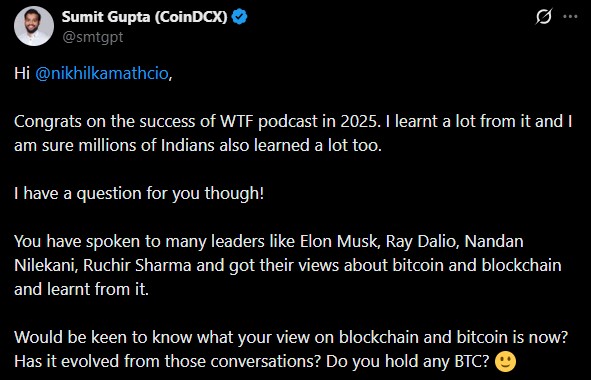在与 CoinDCX 首席执行官 Sumit Gupta 的访谈中,Kamath 坦言自己目前未持有任何比特币,并表示对加密货币的了解有限。他还补充说,计划在 2026 年深入学习区块链和加密货币方面的知识。