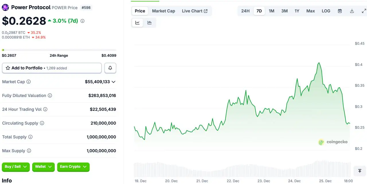 过去七天,POWER股价上涨约3%,突破了早期盘整阶段,并一度逼近0.38美元至0.41美元的阻力区,随后遭遇获利回吐。图表显示,突破前出现了一系列更高的低点,之后股价急剧回落至0.26美元至0.28美元的支撑区域——这是一种典型的上涨后回调,而非结构性崩盘。
