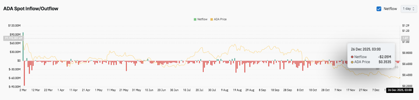 因此,整体结构在价格反弹时仍然有利于卖方。ADA 目前的交易价格略高于 0.35 美元至 0.34 美元之间的关键需求区域。该区域标志着近期低点和重要的转折点。