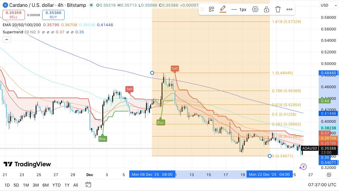 近几个交易日,Cardano价格持续承压,交易员们关注关键支撑位能否守住。ADA目前在0.35美元中段附近交易,反映出短期内整体下跌趋势。市场参与者仍在评估技术信号、衍生品交易活动以及生态系统评论。