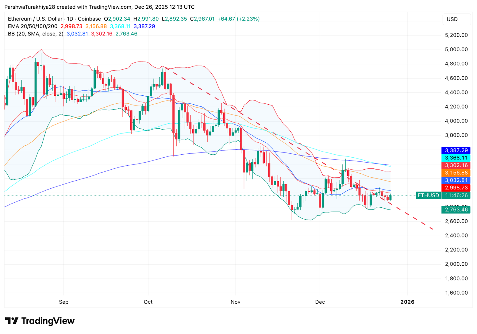 以太坊价格今日在从近期低点小幅反弹后,交投于 2970 美元附近,但其整体结构仍面临压力。价格持续低于下降趋势线和强劲的均线阻力位,令买家持观望态度。12 月 27 日前的市场焦点在于,以太坊能否在关键支撑位上方企稳,还是会重拾回调走势。