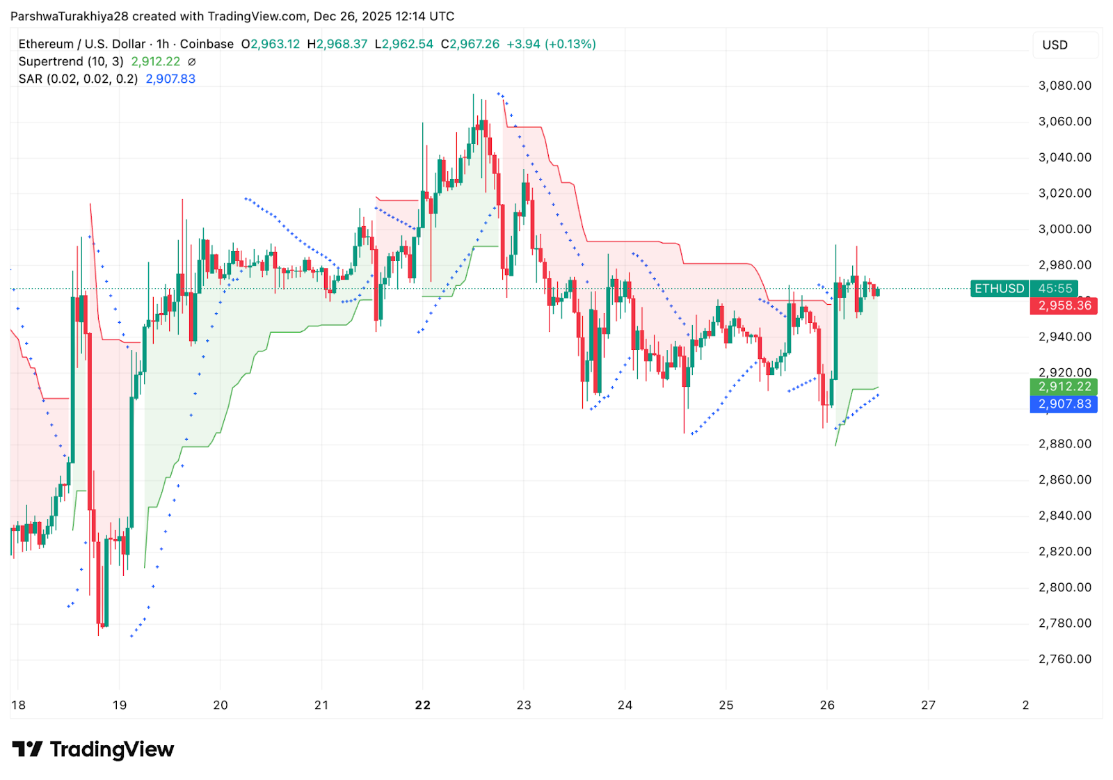 在1小时图上,以太坊在近期低点大幅反弹后,一直在2930美元至2990美元之间盘整。超级趋势线在2912美元附近略微转为正值,提供短期支撑。
