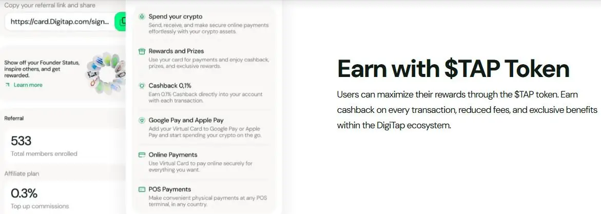 Digitap的优势始于执行力。与大多数预售项目不同,它已经运营着一个完整的全渠道银行生态系统,集成了Visa的虚拟卡和实体卡,使用户能够立即在全球范围内使用加密货币进行消费。
