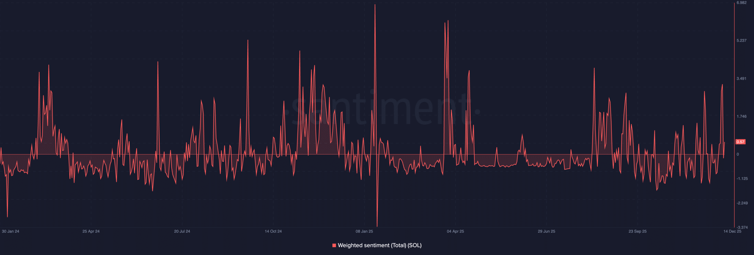 社交情绪数据为情况增添了另一层面的解读。今年以来,围绕SOL的加权情绪波动剧烈,频繁地在正面和负面之间摇摆,并长时间处于中性附近。