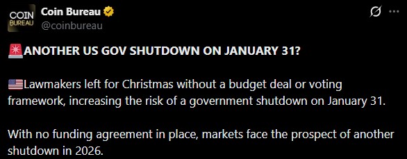 近期数据显示,加密货币市场表现不佳,且对新形势高度敏感。然而,一些投资者将加密货币视为应对财政失灵的避险工具,尤其是在经济停摆与市场预期宽松货币政策同时出现的情况下。