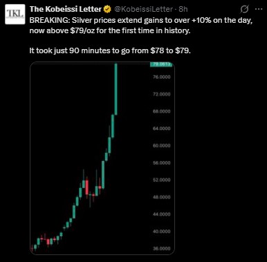 白银价格飙升吸引了众多巨头:导致加密货币下跌的另一个关键因素是资金正流向传统金融工具。值得注意的是,据《科比西通讯》报道,白银价格单日上涨超过10%,历史上首次突破每盎司79美元大关。