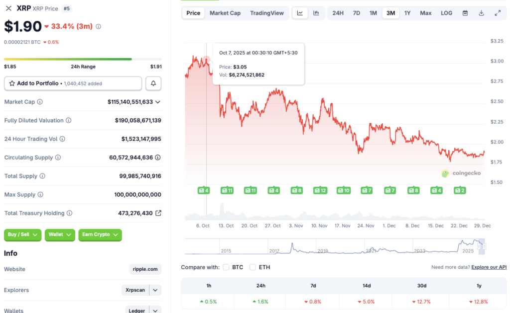 瑞波币 (XRP) 在 2025 年取得了一些历史性的里程碑。这家金融科技公司与美国证券交易委员会 (SEC) 达成和解,随后 XRP 在 7 月份攀升至 3.65 美元的历史新高。过去几个月,XRP 还推出了多只现货 ETF。然而,在加密货币市场遭遇暴跌后,XRP 的上涨势头在 10 月份戛然而止。自 7 月份的峰值以来,XRP 的价格已下跌近 48%。目前,XRP 的价格在 1.90 美元附近盘整,并可能在 2026 年初出现反弹,甚至有可能重回 3 美元大关。