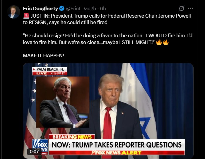 加密货币市场下跌的一个重要原因是美国政府内部的公开争论。根据埃里克·多尔蒂的帖子在 X特朗普总统要求美联储主席杰罗姆·鲍威尔立即辞职。