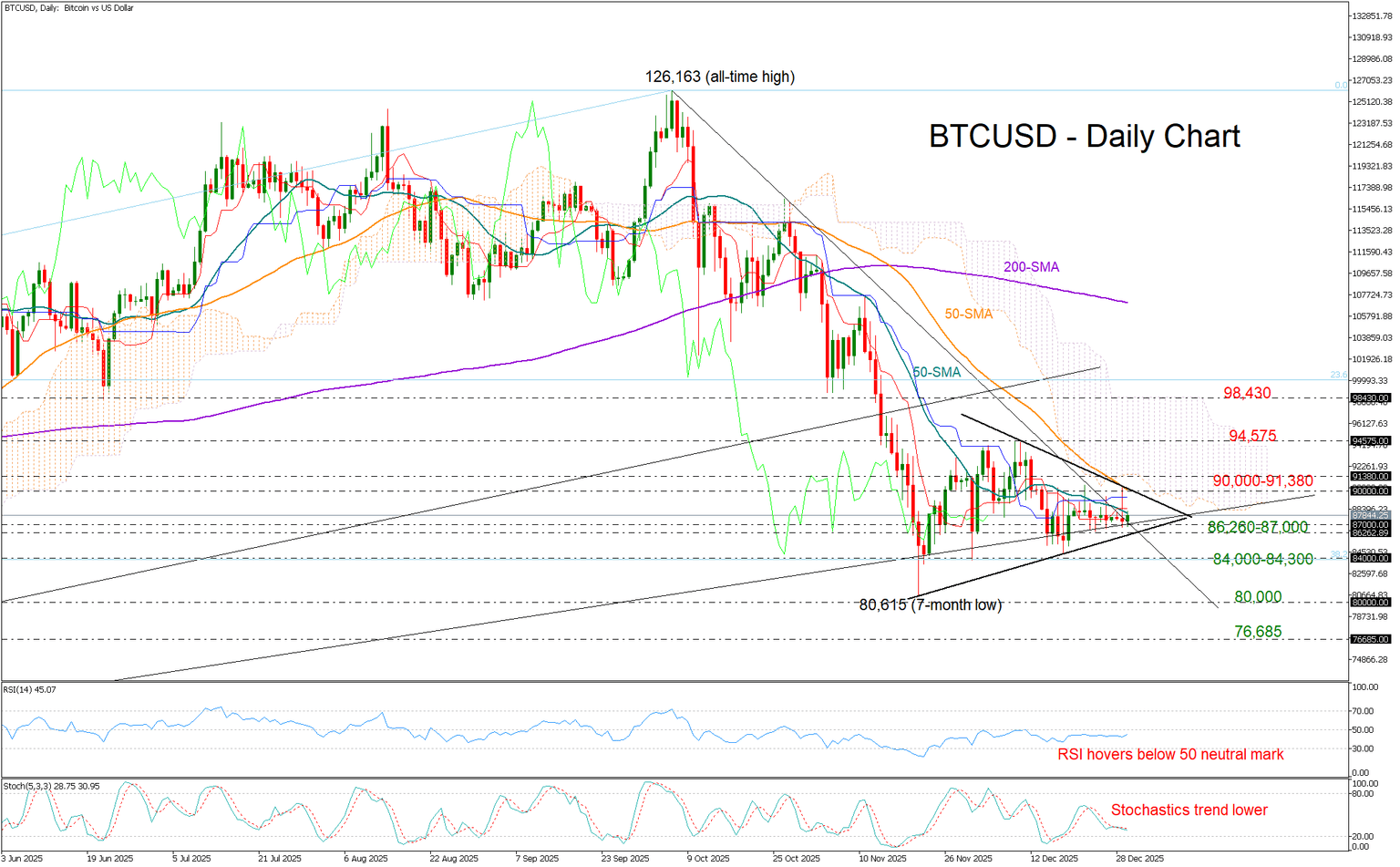 从好的方面来看,多头将继续瞄准……90,000–91,380阻力区涵盖了 Ichimoku 云图的下边界。如果价格能够果断突破该区域,则可能开启新一轮上涨行情,目标位列 98,430 点,除非 12 月份的高点 94,575 点在此之前限制了涨势。