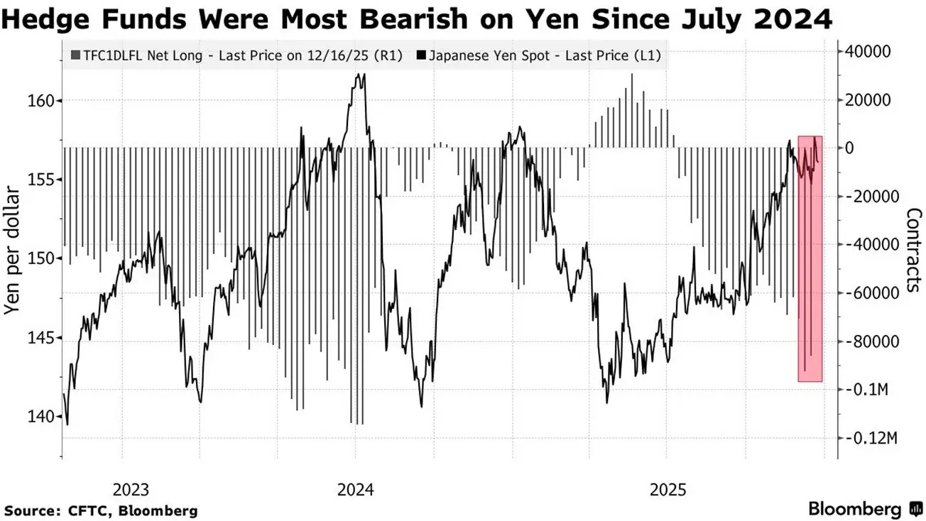 最新仓位数据显示,截至 12 月 14 日当周,杠杆基金持有约 85,000 份日元净空头合约,这是自 2024 年年中以来第二高的看跌读数。