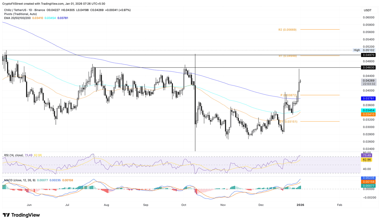 如果 Chiliz 未能守住 0.04000 美元上方,则可能会重新测试 0.03872 美元的中心枢轴点。