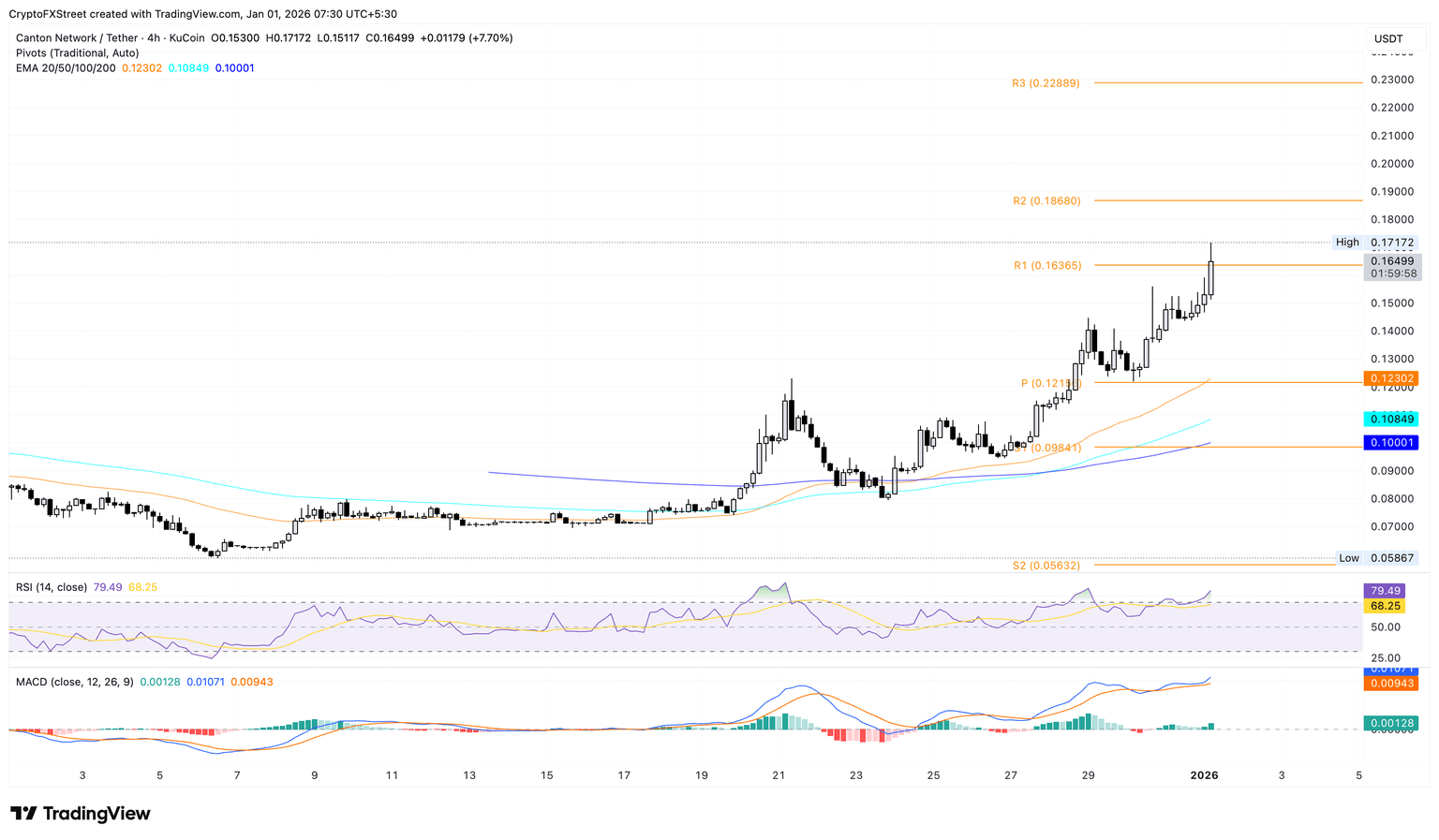 截至周四发稿时,Canton股价上涨近8%,较前一日的3%涨幅再添。日内反弹在4小时图上0.1636美元的R1枢轴点上方保持稳定,多头正等待明确的收盘信号。