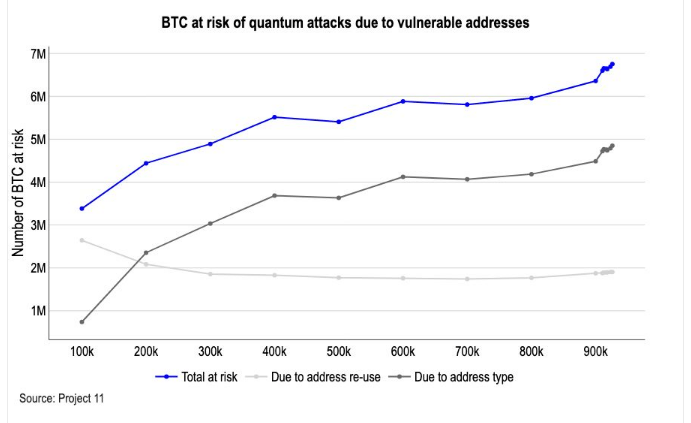 杜昂说大约三分之一比特币由于比特币的公钥已在区块链上公开,其供应可能存在结构性风险。这一比例接近33%,约合651万枚比特币,这些比特币存储在公钥已泄露的地址类型中,理论上,足够强大的量子计算机可以利用这些地址推导出私钥。报告指出,这种风险主要源于地址重复使用和较旧的钱包格式。