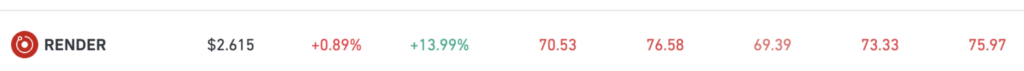 同样地,渲染(RENDER该代币价格为 2.615 美元,近期涨幅更为强劲,过去 24 小时内上涨了 13.99%,反映出人们对该代币的兴趣日益浓厚。