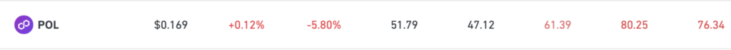 从多边形开始(POL该代币价格为 0.169 美元,短期内表现喜忧参半,过去 24 小时内下跌了 5.8%。然而,其相对强弱指数 (RSI) 更清晰地反映了其潜在的市场动能。