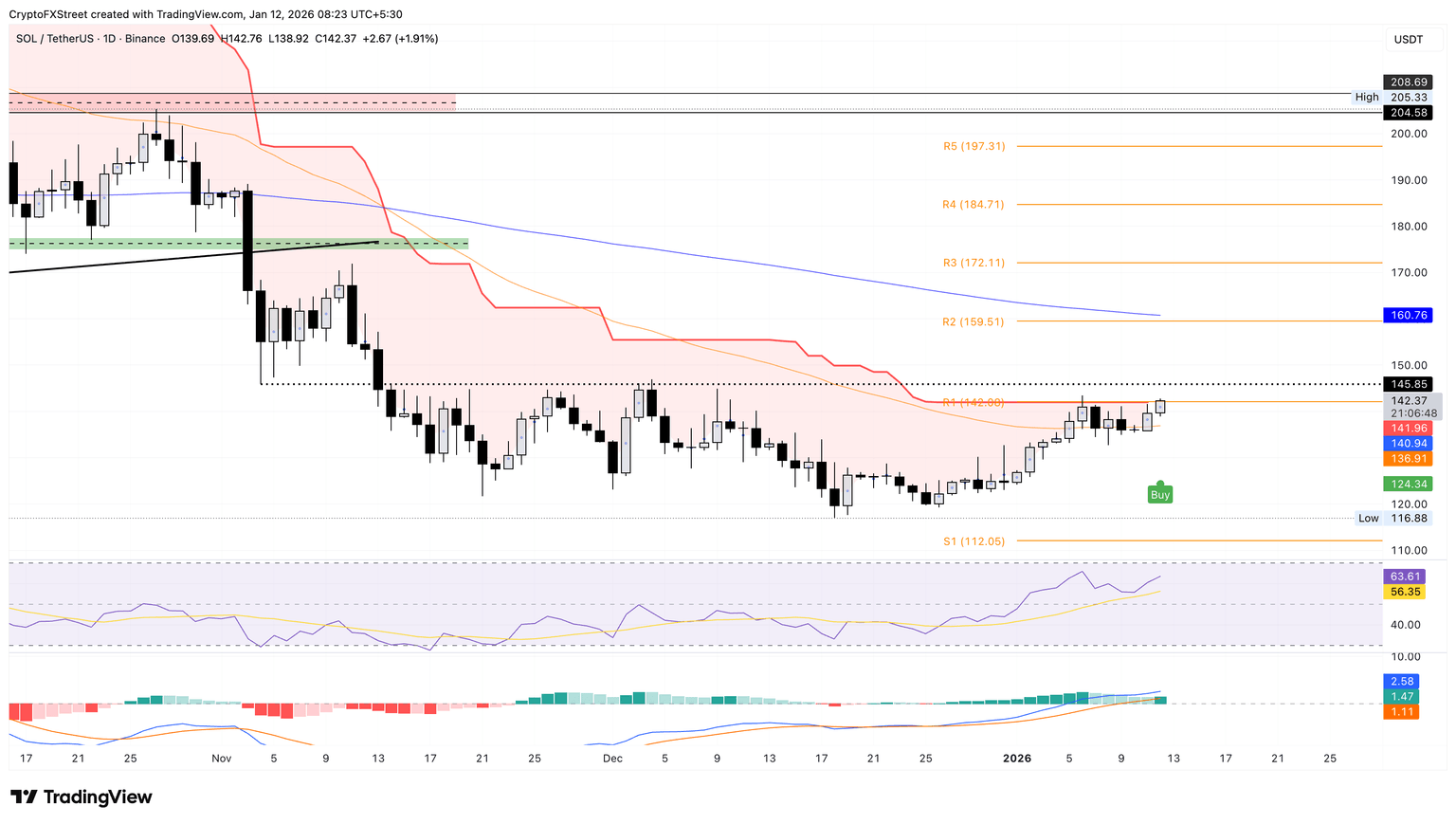 然而,Solana 需要突破 11 月 4 日的低点 145 美元才能维持反弹势头,该低点自 11 月中旬以来一直限制着其涨幅。如果收盘价高于该水平,则可能上探 150 美元,之后是 159 美元的 R2 枢轴点。