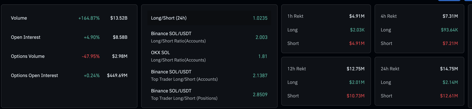 衍生品方面,流入索拉纳期货的资金表明交易者需求回升。CoinGlass数据显示,SOL期货未平仓合约(OI)在过去24小时内上涨4.90%,达到85.8亿美元。