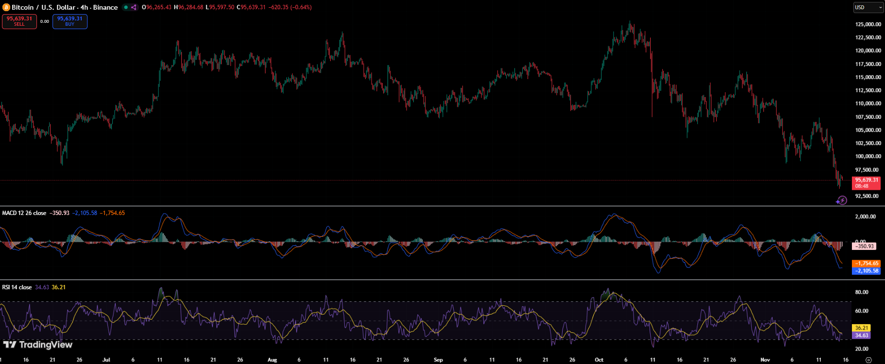 比特币的价格走势反映了这种压力。在4小时图上,BTC已跌至95,600美元左右,延续了本月初开始的急剧下跌趋势。