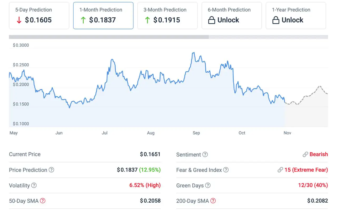狗狗币交易量约为0.16美元11月13日,狗狗币价格在24小时内下跌约7%。狗狗币的未来走势取决于多头能否重拾动能,并将价格推高至0.20美元以上。技术分析分析师警告称,如果跌破 0.14 美元,狗狗币可能会重新测试 10 月份接近 0.10 美元的低点。