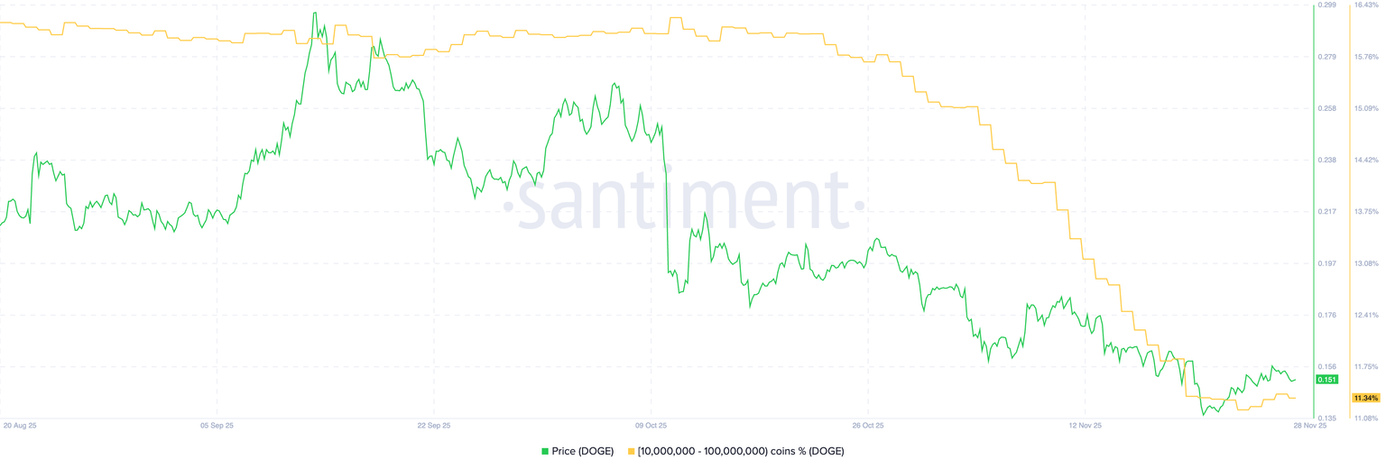 大额投资者(也称“鲸鱼”)持续抛售狗狗币,进一步加剧了抛售压力。下方的供应分布指标显示,持有1000万至1亿枚狗狗币的投资者群体目前占总供应量的11.34%,低于11月1日的15.11%和10月1日的16.05%。