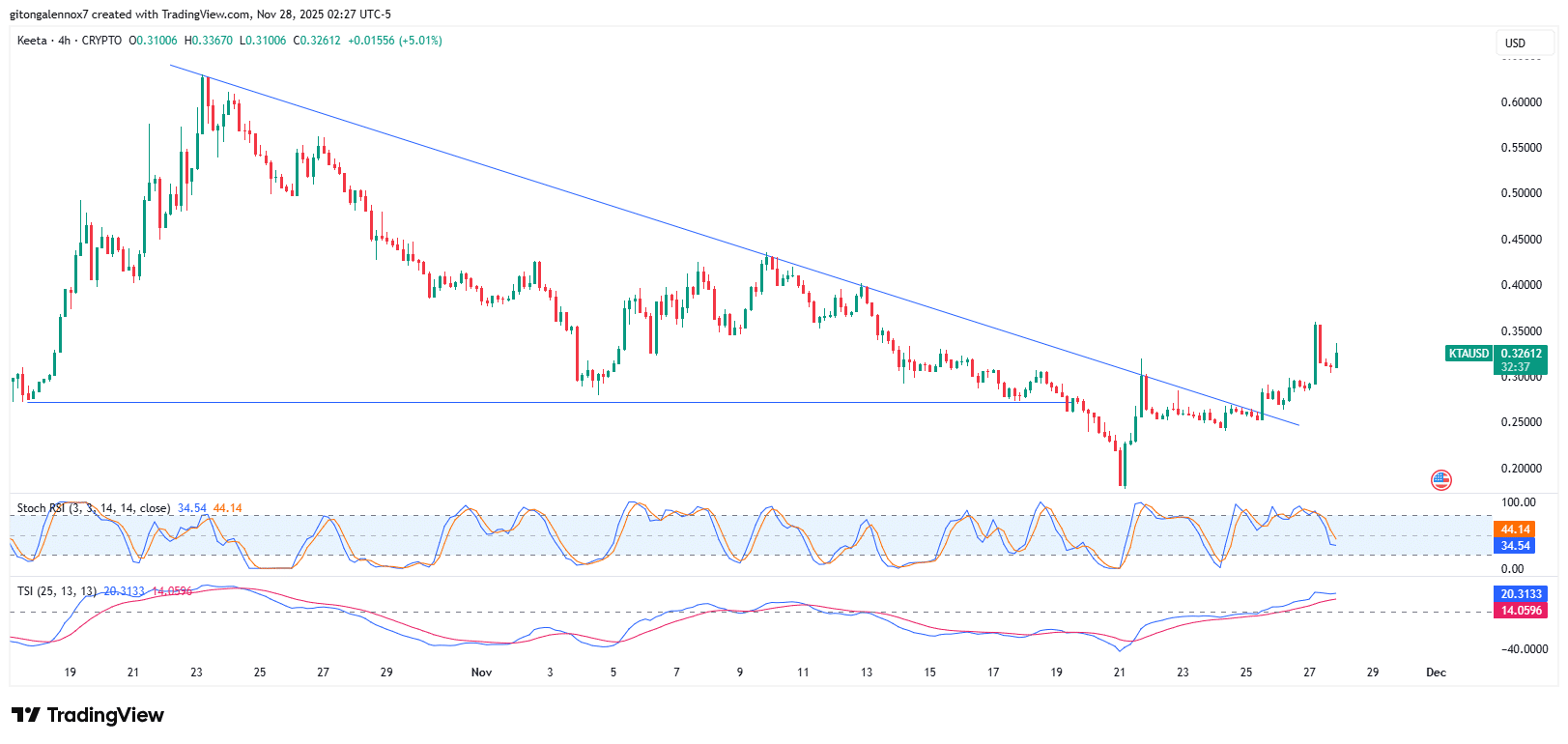 - Keeta 的上涨势头得益于强劲的技术动能和战略合作伙伴关系,但 0.40 美元至 0.45 美元的阻力位仍然至关重要。