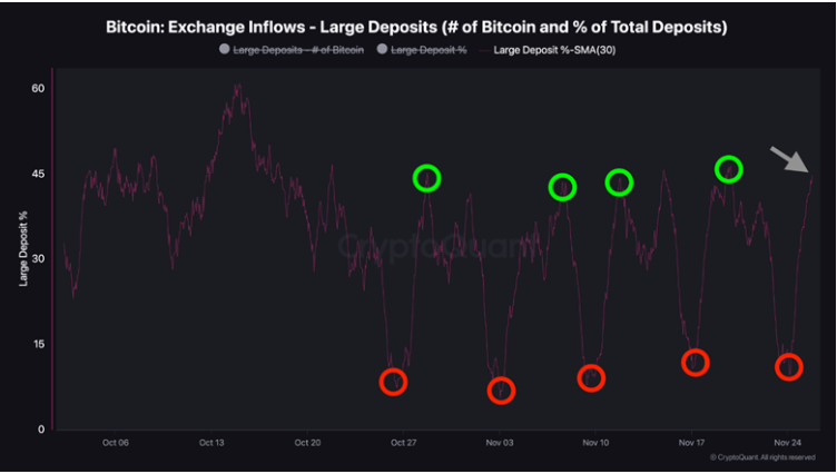- 比特币交易所的大额存款不断增加,这可能会给近期的支撑位带来更大压力。