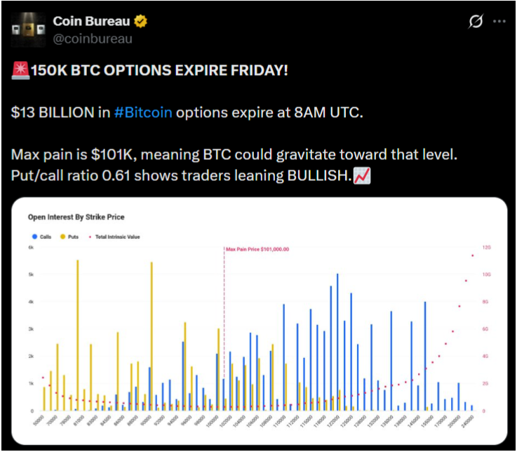 - 在最新的比特币新闻中,150,000 个比特币期权将于周五到期,最高止损点为 101,000 美元,看跌/看涨期权比率为 0.61。